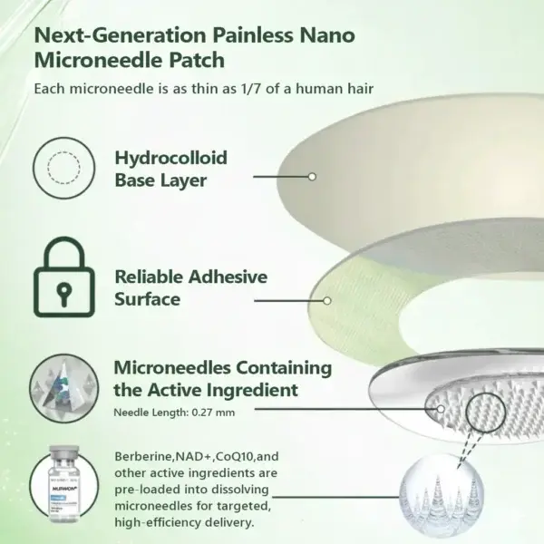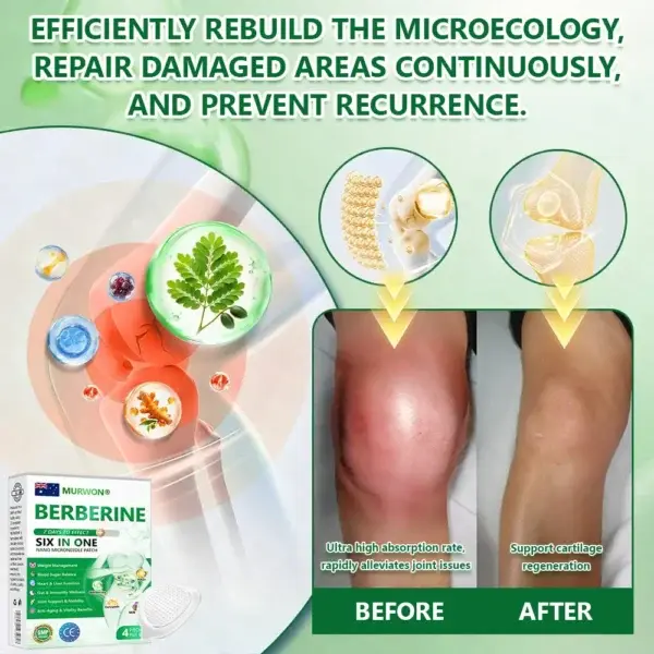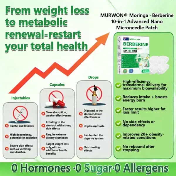 We then moved to large-scale clinical studies with over 5,000 participants, validating the performance of the MURWONยฎ 6-in-1 Nano-Microneedle Berberine Patch. These benefits are particularly powerful for adults over 40. Backed by contemporary medical research, our product has undergone rigorous review under CE regulatory standards, confirming its safety and efficacy. This formulation represents a major scientific breakthrough, offering a natural, sustainable option for long-term weight management.โ